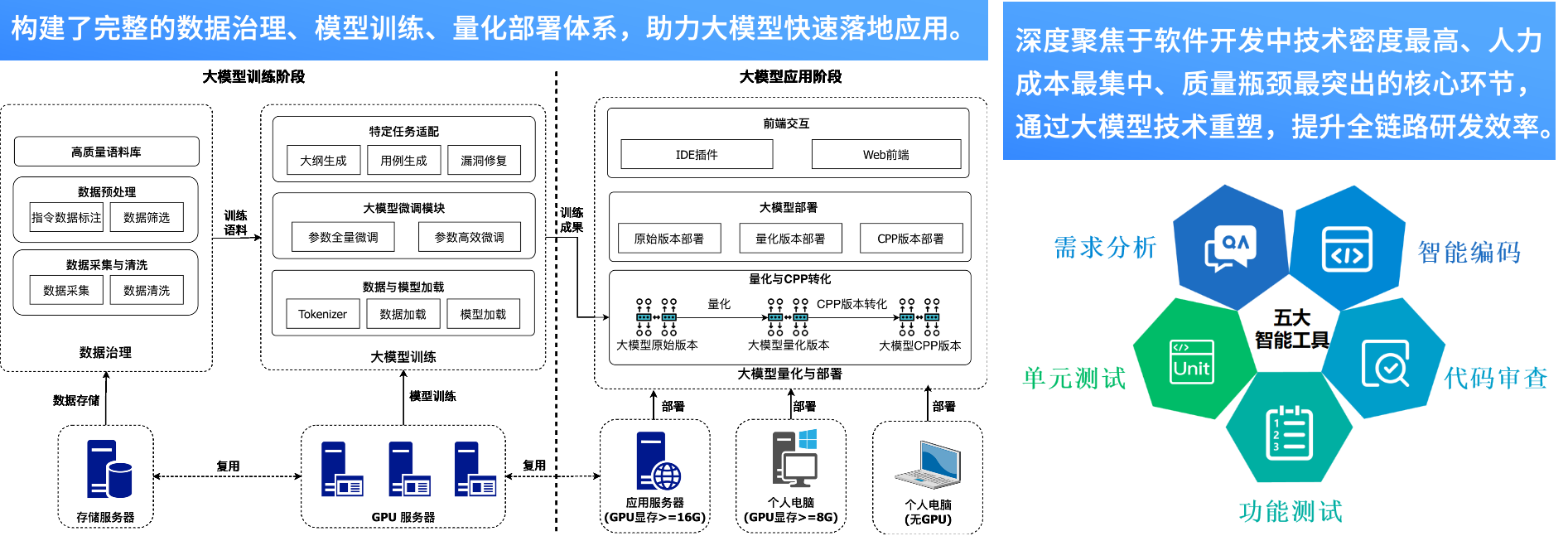 面向行业级软件智能化开发难题,联合国内多所顶尖高校与科研院所,训练嵌入式软件研发大模型,构建了完整的数据治理、模型训练和量化部署体系,助力大模型在行业快速应用,同时围绕行业实际使用需求,打造行业级应用智能工具,支撑软件研发全链路,研发提效20%以上。