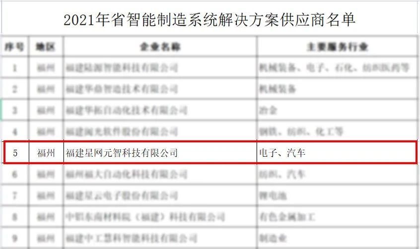 近日,省工业和信息化厅公布了2021年省智能制造系统解决方案供应商名单,福建星网元智科技有限公司成功入选!